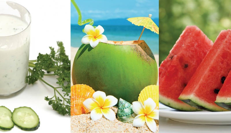 Switch to green tea or herbal tea for your daily dose of caffeine. Green tea contains a plethora of antioxidants. In between, keep yourself revived with lemon water with a dash of rock salt and roasted and ground cumin (jeera) seeds. With their high Vitamin C content, lemons strengthen the immune system and prevent heat stroke. Also, they are alkaline on digesting, thus being a great acidity-counter. You could also opt for coconut water, which, owing to its high potassium, natural electrolytes and mineral content, replenishes the minerals that get lost during perspiration. In fact, coconut water is considered a wonder food and called the ‘fluid of life’. An oral rehydration medium, it is instantaneously refreshing, subtly sweet, keeps the body cool and contains a host of minerals that are excellent for the hair and skin. Further, application of coconut water on the body prevents prickly heat and boils and gets heat rashes to subside.