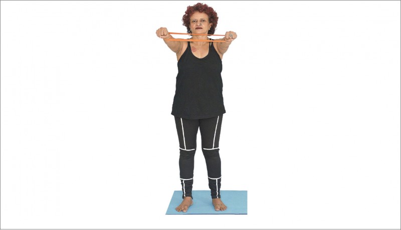 This one is done with a short TheraBand loop. In case you have the longer version, knot it firmly to create a loop for similar impact. Stand straight in the palm tree pose (tadasana) with feet slightly apart. Pass the loop through both hands till it rests at the muscles of the forearm. Raise arms to shoulder level. Inhale, gentle move arms apart. Exhale, slowly release them back. Repeat a few times. Remember not to release too fast. If you do, your muscles will not get worked out much. Releasing slowly is more challenging. Make this the standard for any other band-related pose you do. Also remember not to bend your arms at the elbow. This means you have gone over your range and are likely to stress your joint. Ensure you have a focused practice. Benefits: This is used as rehab to build confidence and strength back in the arms, even after injuries. The muscles are superbly challenged. It is important to create this resistance and challenge in the muscles because bones closer to these muscles respond by becoming denser and fitter.