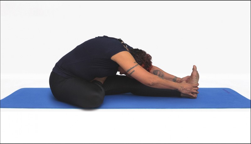 This elevates the classic forward bend (paschimottanasana) into a more intense one. It also combines two poses (half lotus/ardha padmasana). To do this, extend your legs out in front. Fold your right leg at the knee, placing the right foot at the left hip joint. Raise both hands overhead, inhaling deeply. As you exhale, bend forward, looking ahead, to reach your hands round the left foot. Then, relax the neck to reach your