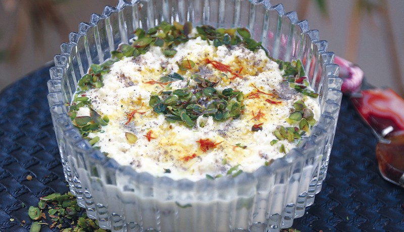 Prepare saffron water by rubbing it in 1 tsp warm milk until the milk turns orange. Set aside. Heat 1 litre of milk in a pan and allow it to thicken. Cook on a high flame and stir continuously so that it thickens without turning red. Switch off the flame when it is still free-flowing and set this rabdi aside. Heat the remaining 1 litre milk. As it comes to a boil, add 3 tbsp of yoghurt and a very small pinch of citric acid. Stir. As soon as the milk curdles, switch off the flame. Immediately, strain it in a sieve. You will now get soft paneer. (Adding the small pinch of citric acid makes the paneer extra special. Do not waste the strained liquid, says Nirmalaji. Use it to knead dough and prepare soft chapattis). Mix the paneer and rabdi, mashing them lightly for 2 minutes with the back of a spoon. Add sugar and mash for another minute. Decorate with pistachio slivers, dots of saffron water and cardamom powder. Serve warm or chilled. This can be served as a mithai at the beginning of meal or as a dessert at the end. It is also a great accompaniment with hot, tava-roasted parathas.