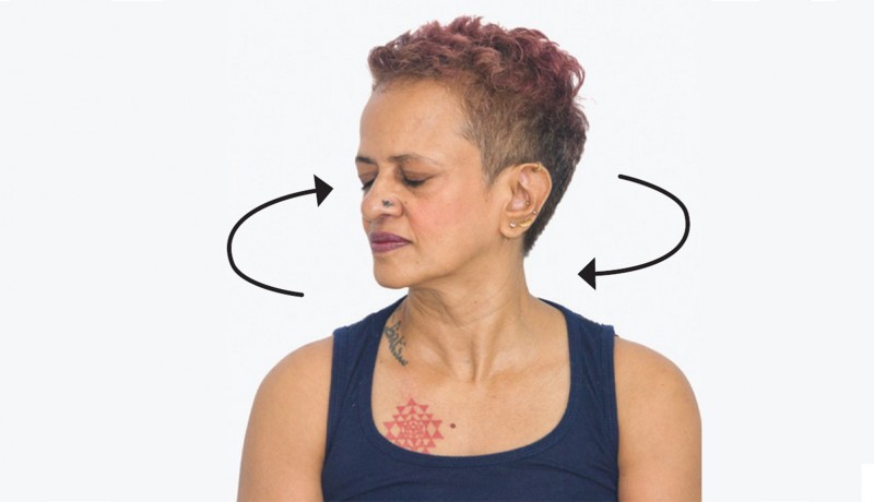 This may be done seated or standing. Very gently, roll the neck in a clockwise manner and then in an anti-clockwise manner. This is one round. Do three to five rounds daily, in the morning and evening. Those with neck problems must avoid this altogether, or do only half circles, unless guided by an expert. Movements must be very gentle. Most people do this without awareness and very fast. It is best to coordinate the movement with your breath, doing inhalation in half the movement and exhalation in the other half.