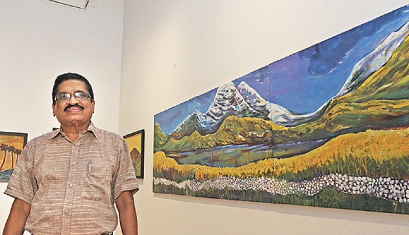 “Touch and feel my paintings,” insists the 69 year-old editor of Malayala Manorama, K A Francis, whose exhibition of paintings titled Onam Pacha (Harvest of Leaves) recently took place at Durbar Hall in Kochi. Also the former chairman of the Kerala Lalit Kala Akademi, Francis’s new collection, the first in five years, is a sharp deviation from his usual work as a tantric painter of Vishnu padam and Lakshmi padam used in puja rooms and at doorsteps. “There is an abundance of green during Onam, the harvest season, which inspired me to make this collection. I have added texture to the different elements in the paintings, so they don’t just appear different but feel different too,” Francis tells us. For example, on the painting ‘White on Green’, one can actually feel the leaves in the foreground as a waterfall pans evenly into the distance. Replete with mustard, greens and blues, the 30 acrylic-on-canvas paintings depict the verdant fecundity of Kerala.