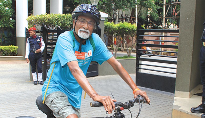 I cycle an average 53 km a day, which adds up to 1,600 km a month. I aim to ride the distance between the earth and the moon; that is, 384,400 km. I need only 11,000 km more to achieve that goal. I need to mention here that I am in no way encouraging other seniors to break the rules their doctors may have prescribed. Obviously, everyone cannot do it my way.