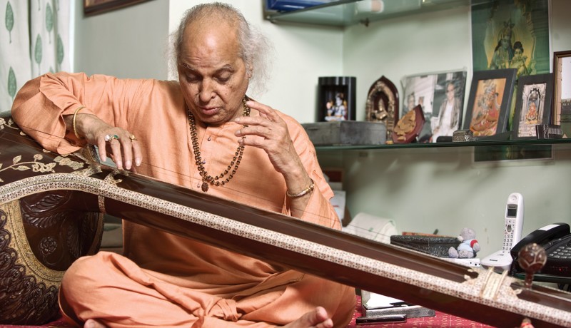 First things first. Pandit Jasraj is allergic to perfume. As we walk into his four-bedroom flat in Versova in suburban Mumbai on a rainy September morning, he greets us abruptly: “Keep your distance if you are wearing perfume. It affects my voice.” The instruction would have sounded terse coming from anyone else. But uttered by Panditji — seated at his dining table, wearing a short-sleeved white muslin kurta, his eyes sleep-deprived and his fuzzy white hair casting a disheveled halo — it sounds anything but curt, especially when he flashes his roguish smile. His voice is gentle even as he admonishes his young household help when she hurriedly takes away his cup of unfinished coffee. Minutes later, he thanks her profusely when she warms up his third large cuppa. He throws a minor tantrum when we ask him to change into formal clothes for photographs. And later indulges us by changing into not one, but three outfits for an elaborate photoshoot on his terrace through an insistent drizzle.